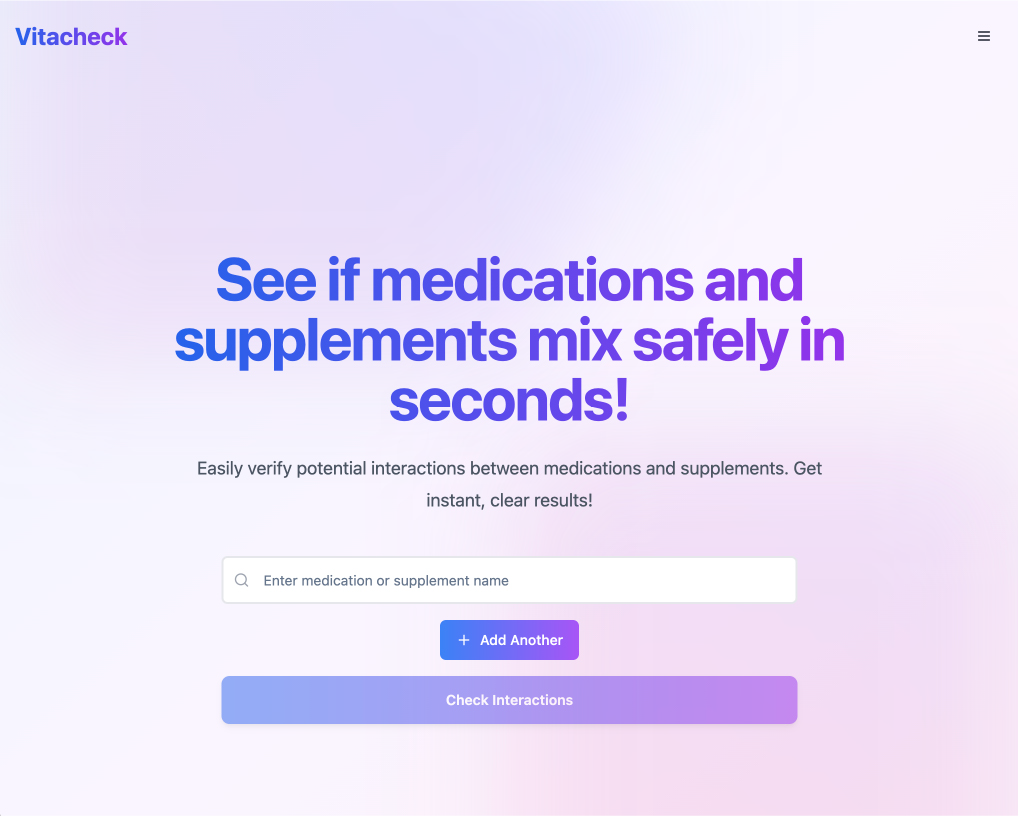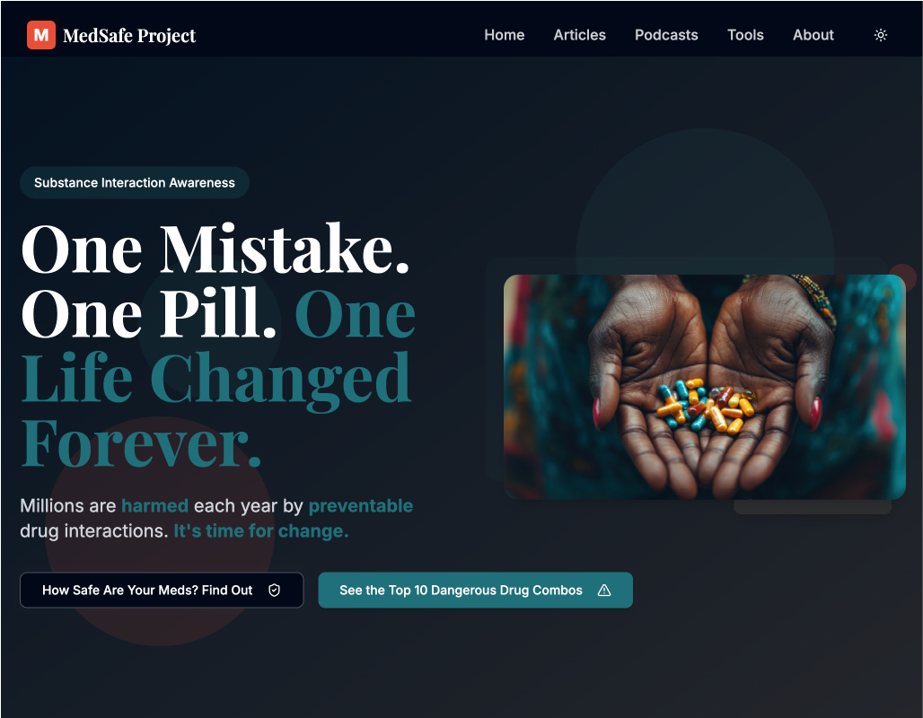 While building Vitacheck, I realized the deeper issue wasn't just outdated tools, it was a lack of awareness. Most people don't realize how common and dangerous certain drug interactions can be, especially when mixing prescriptions with supplements or over-the-counter substances. MedSafe is my way of addressing that gap: using writing, design, and clear information to make these risks more visible, without creating fear. The goal is to help people stay safe by simply knowing more.