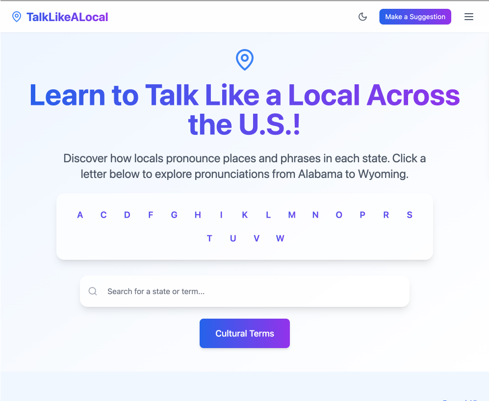 This project came from a curiosity about the subtle ways language reflects place and how much meaning lives in the way people speak, region to region. I've always loved exploring new places, and part of that for me is learning how people express themselves. As tech continues to blur regional identities, I wanted to build something that does the opposite, using technology to help preserve those nuances and make them easier to appreciate.
